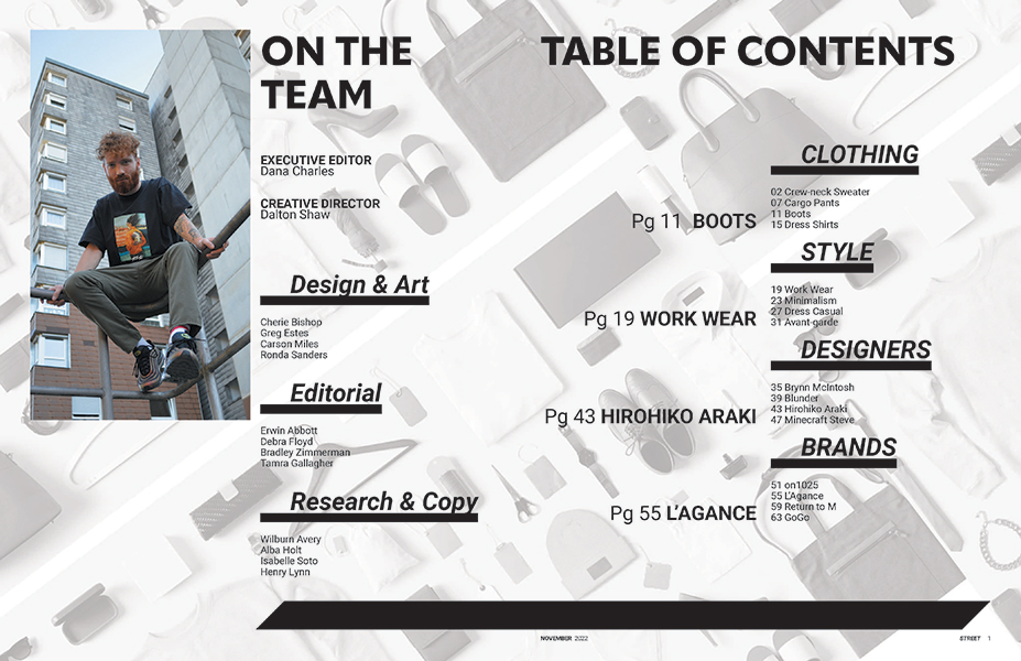 Street has a clean and sleek style with some sense of movement. This appeals to their audience because they like consuming information quickly. The sleekness and sense of movement is caused by their use of italicized type. Large underline bars that stick out from words also add to this as it makes text look like it is sliding along the underline. This sense of movement is a representation of the magazine being with the times as fashion moves quickly and is ever changing.