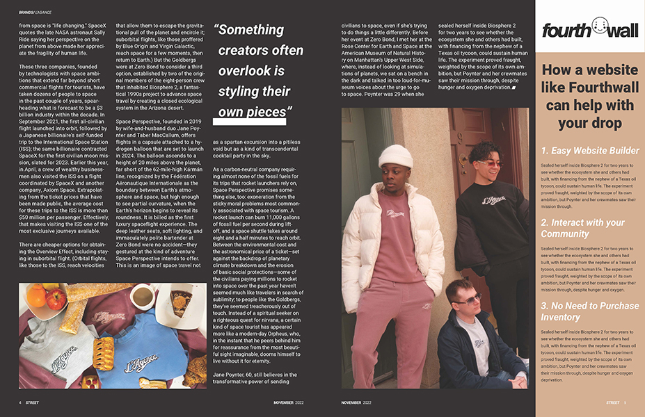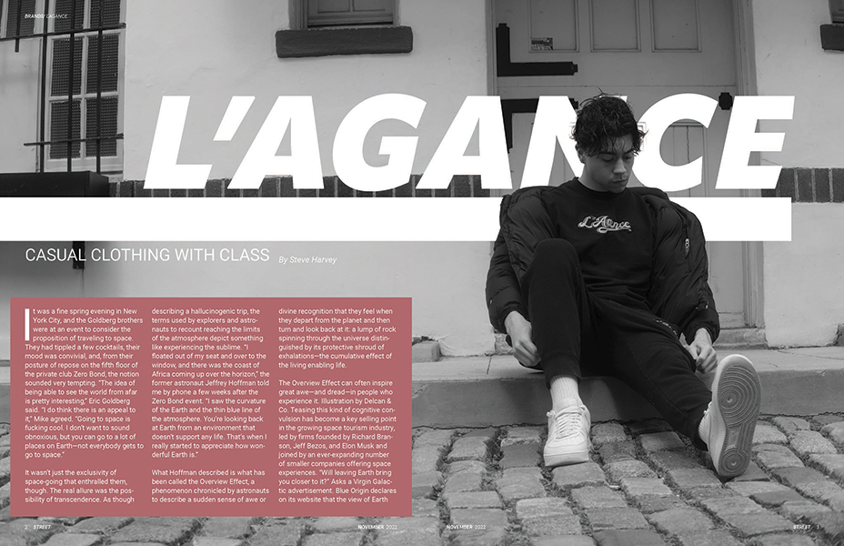 Street uses realist sans serif fonts due to its easy readability. This readability fits the sleek and clean style of the magazine appealing to their audience who consumes information quickly. Hierarchy in text is provided by size and the boldness of the stroke. Bold is applied to almost everything besides body text, sub heads, and by lines. Another layout choice influenced by the audience is having text not fill up a lot of pages. Walls of text would probably turn away the audience so the odd pages in the article are taken up mostly by an image. Large images are also great for showing off clothing and how it looks on someone which can influence people to buy them.